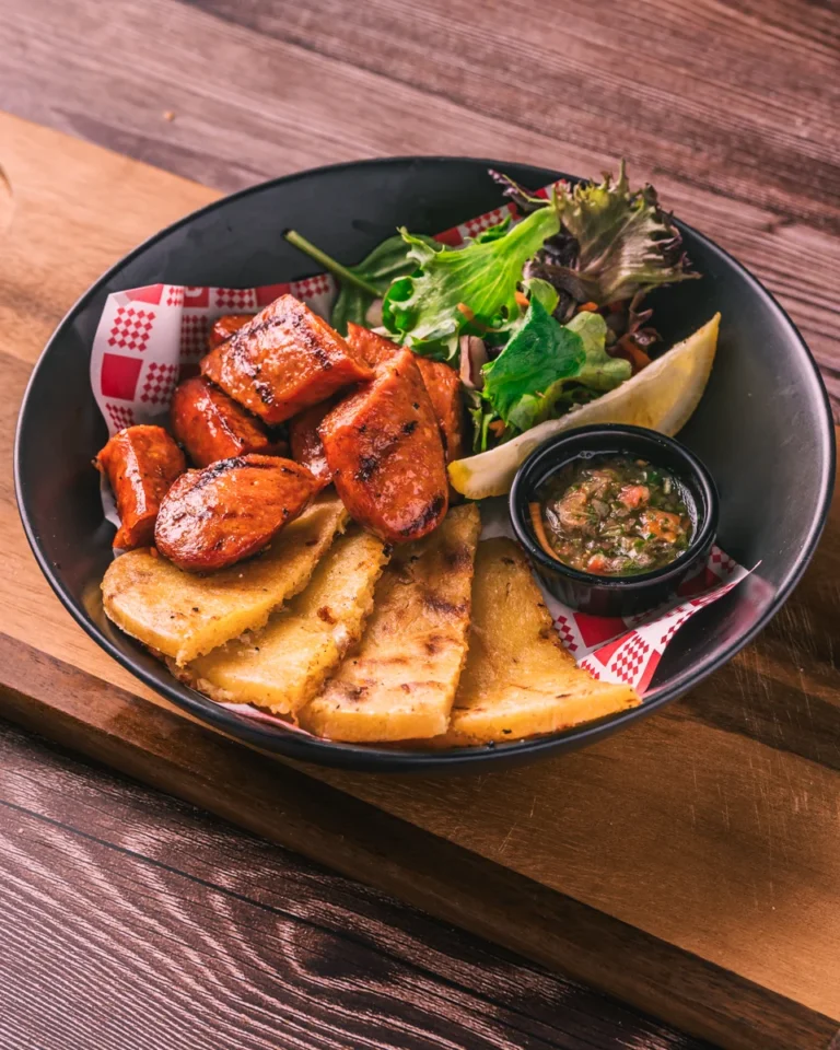 Grilled steak, wood fired pork, chorizo, salt and pepper calamari, Grilled chicken, and fried chicken wings